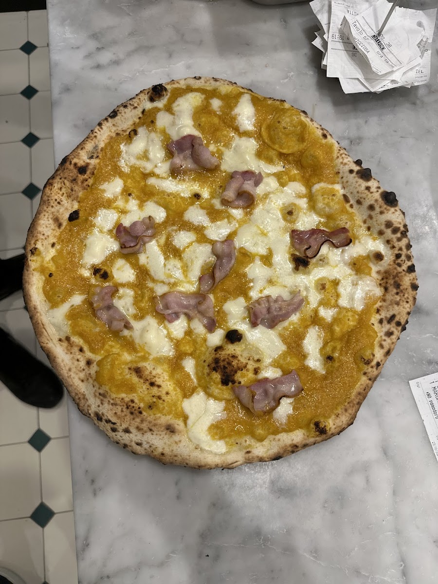 We went there for a lunch on a Sunday, drove all the way from another town to have their pizza. I had their pizza in Rome many years ago, and was looking forward to repeat the good experience. We didn’t have to wait for our table, and the waiters were very accommodating, great service! We had some appetizers, they were good. I chose a calzone fritto just because I was curious and never had it before. We also ordered pizza margherita and pizza napoletana. The size was very big, we were stuffed, I had to bring half of my calzone home, I ate also some of the pizza Margherita and it didn’t disappoint. Their pizza aren’t for those who like their pizza sturdy. My husband liked his pizza but complained about 2 things, that the anchovies should be more well distributed so you can have some on each bite or every other bite at least and the that the crust wasn’t crispy enough for him. I was okay with it. The star of the lunch was indeed the calzone, it was gigantic, the dough was so thin and crispy, the filling was delicious and a lot!